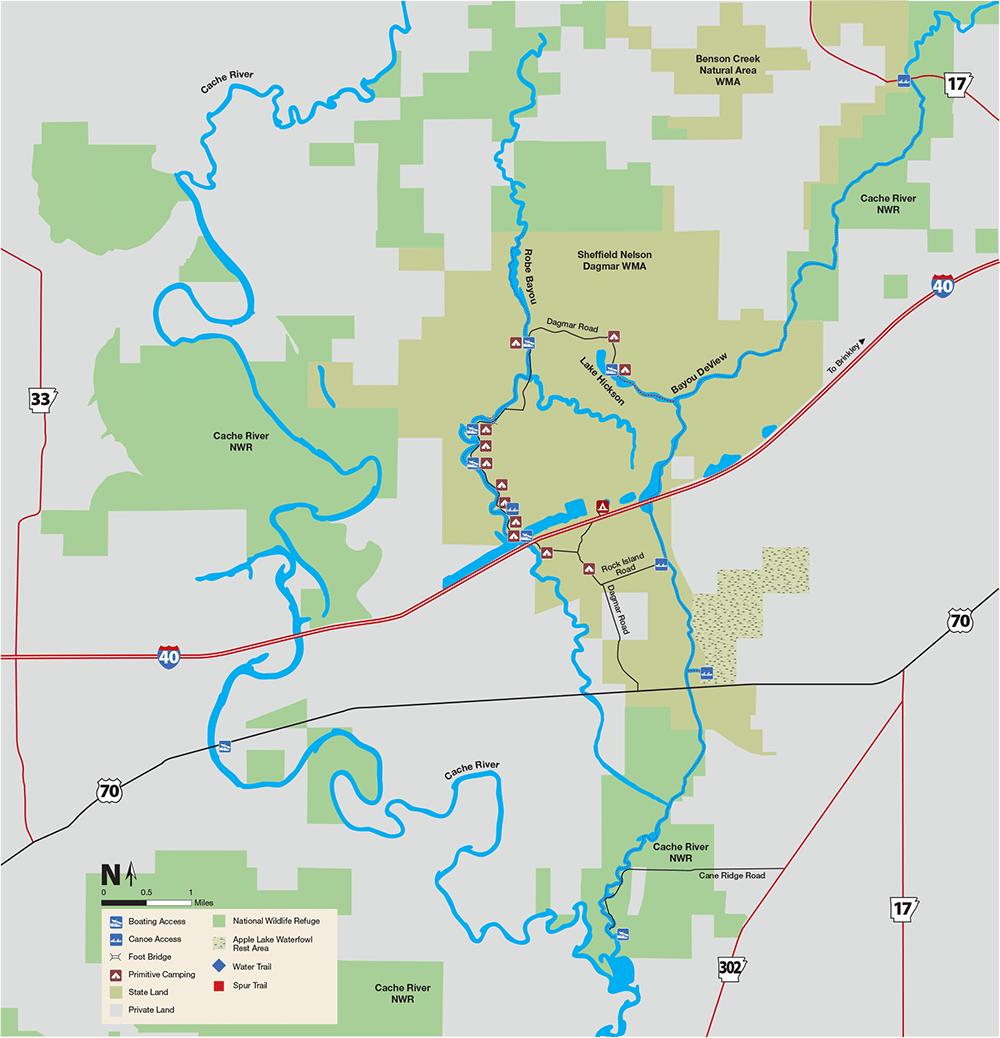 Hunters pursue deer, waterfowl and small game on the area. Boating hours are limited during waterfowl seasons. Furbearer trapping is permissible on the WMA. Check the current Arkansas Hunting Guidebook for details and wear hunter orange when appropriate. Leash pets for their safety.