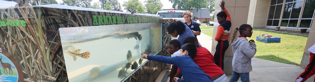 Two mobile aquariums are available free of charge for display at qualifying community events, such as educational programs, outdoor shows, schools, youth organizations, or other family-friendly events. At each appearance, they are stocked with a large variety of native fish species and aquatic turtles. A program member will be in attendance to answer questions concerning aquatic resources, while also providing educational literature. Click the links below for more information, and fill out the application below to request AGFC support.