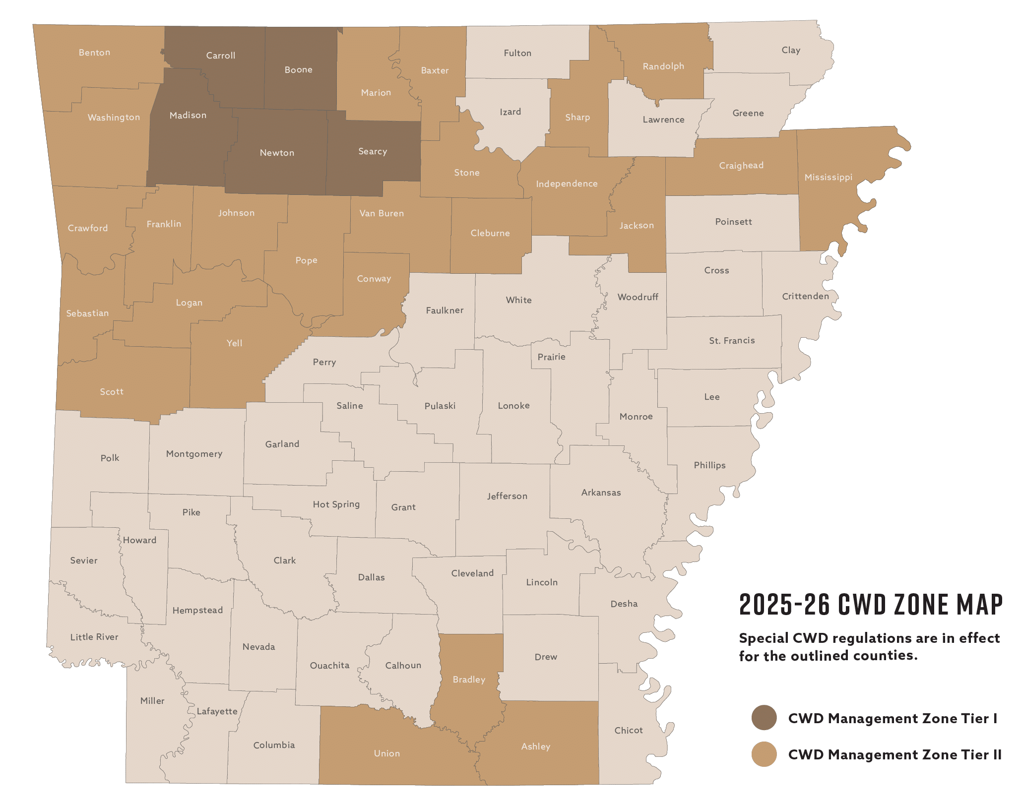 The AGFC has enacted the following special regulations to help slow the spread of CWD in Arkansas.