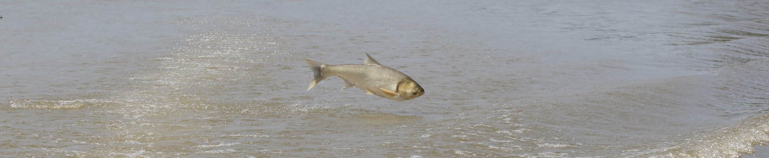 Invasive carp native to Southeast Asia, specifically silver carp (Hypophthalmichthys molitrix), bighead carp (Hypophthalmichthys nobilis), grass carp (Ctenopharyngodon idella), and black carp (Mylopharyngodon piceus), were introduced into the U.S. in the 1960s, 70s and 80s to help control nuisance algae, aquatic plants and snails. Unfortunately, escape from aquaculture facilities and stocked waters during floods, and through intentional releases, resulted in their rapid spread throughout the Mississippi River Basin. Invasive carp continue to increase their range and abundance in many of our state’s major river systems, and threaten to destabilize ecosystems by competing with native aquatic species for food and disturbing critical habitats. Additionally, silver carp can create a hazard to boaters due to their jumping behavior when startled.