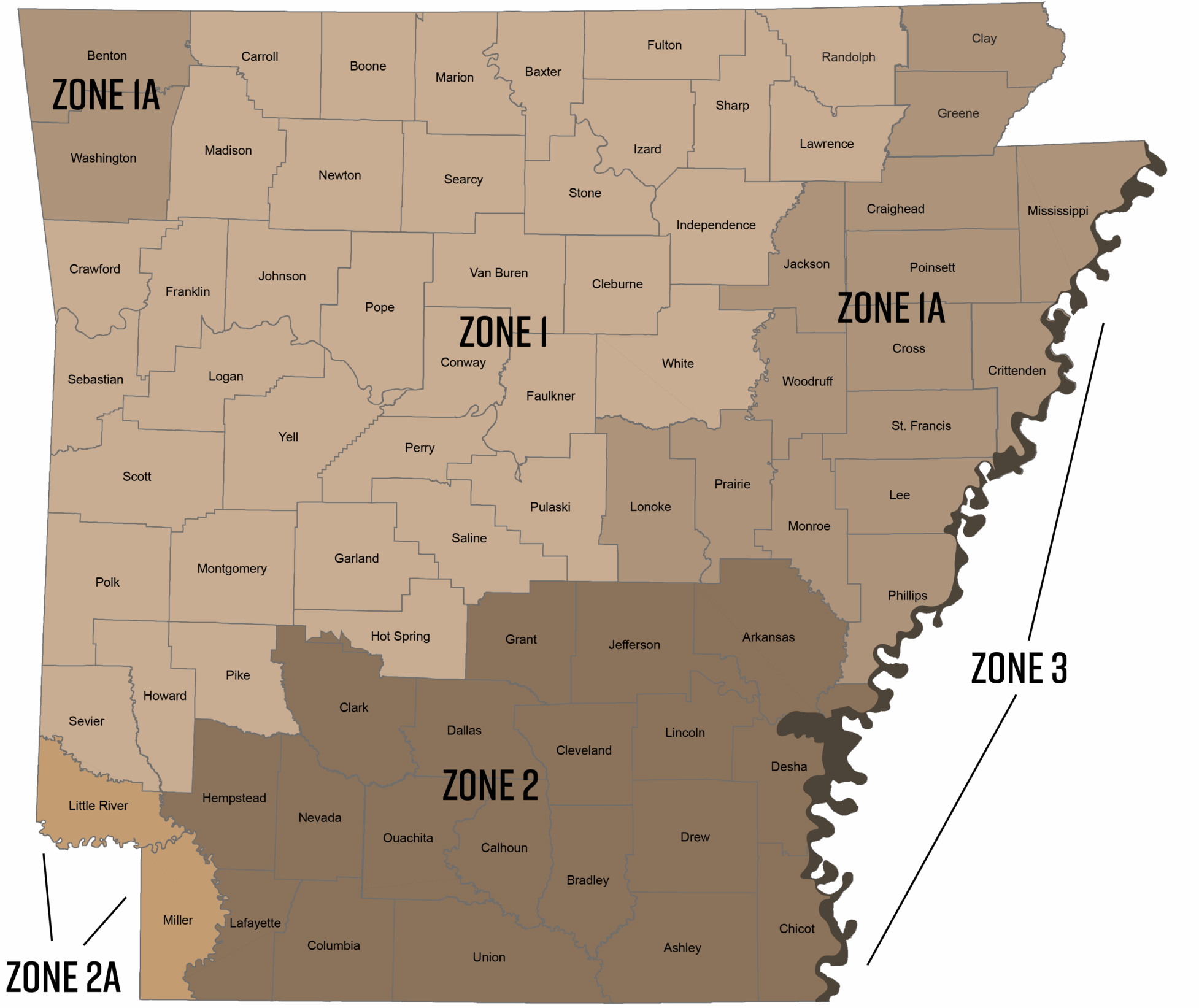 - Zones follow county lines with the exception of the inside of the Mississippi river levee in Crittenden, Lee, Mississippi, Phillips and St. Francis county. See the current Hunting Guidebook for WMA Zone info.