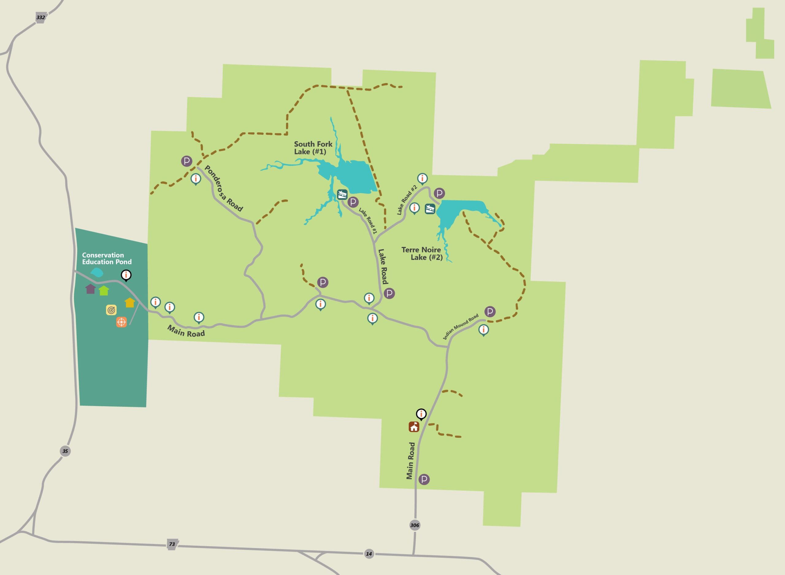 - Travel 1 mile to the Rick Evans Grandview Prairie WMA welcome sign and tour map.