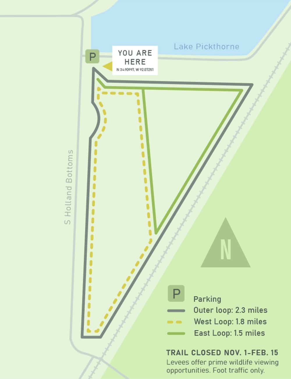Hunters pursue deer, waterfowl and small game on the area. Check hunting seasons at agfc.com and wear hunter orange when appropriate. Check the current for details.