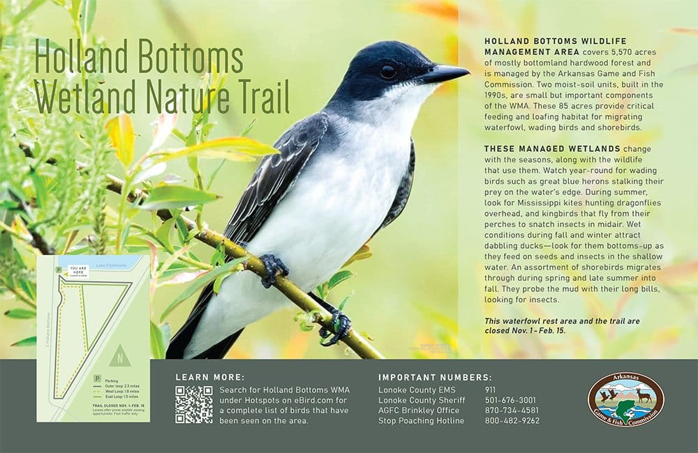 Holland Bottoms WMA covers 5,570 acres of mostly bottomland hardwood forest. Two moist-soil units, built in the 1990s, are small but important components of the WMA. These 85 acres provide critical feeding and loafing habitat for migrating waterfowl, wading birds and shorebirds.