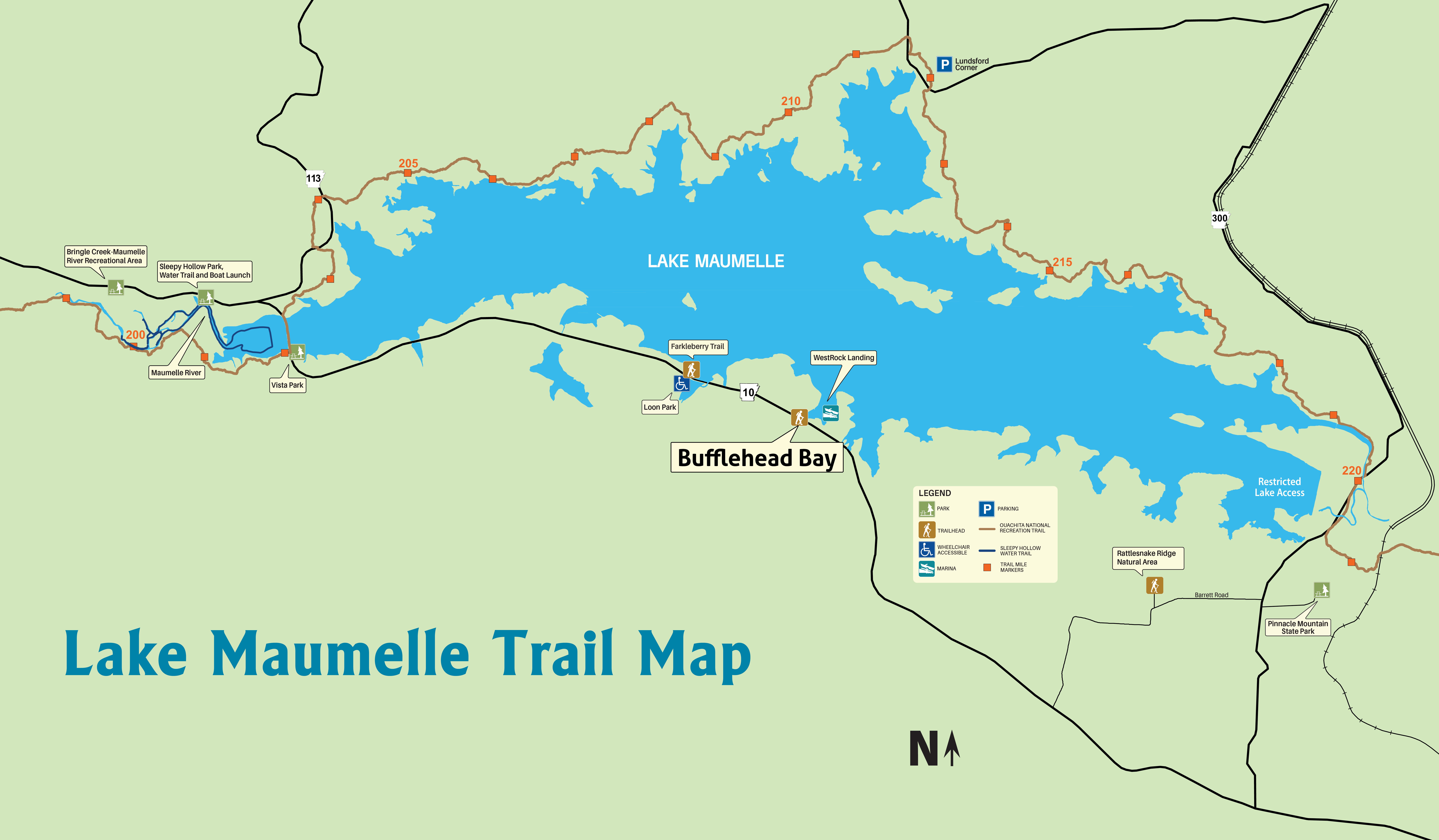 Lake Maumelle’s eastern edge lies about eight miles west of the junction of Interstate 430 and Arkansas Highway 10 in Little Rock. The three trailhead parking areas are to the west along Highway 10.