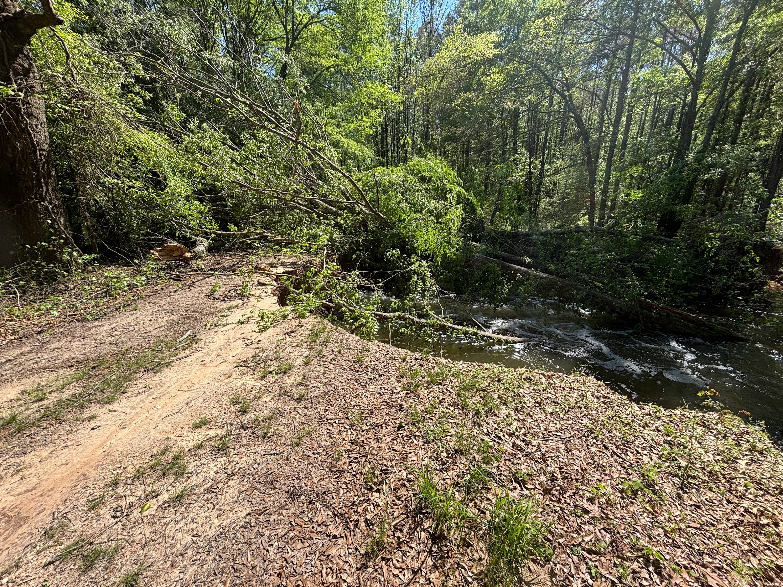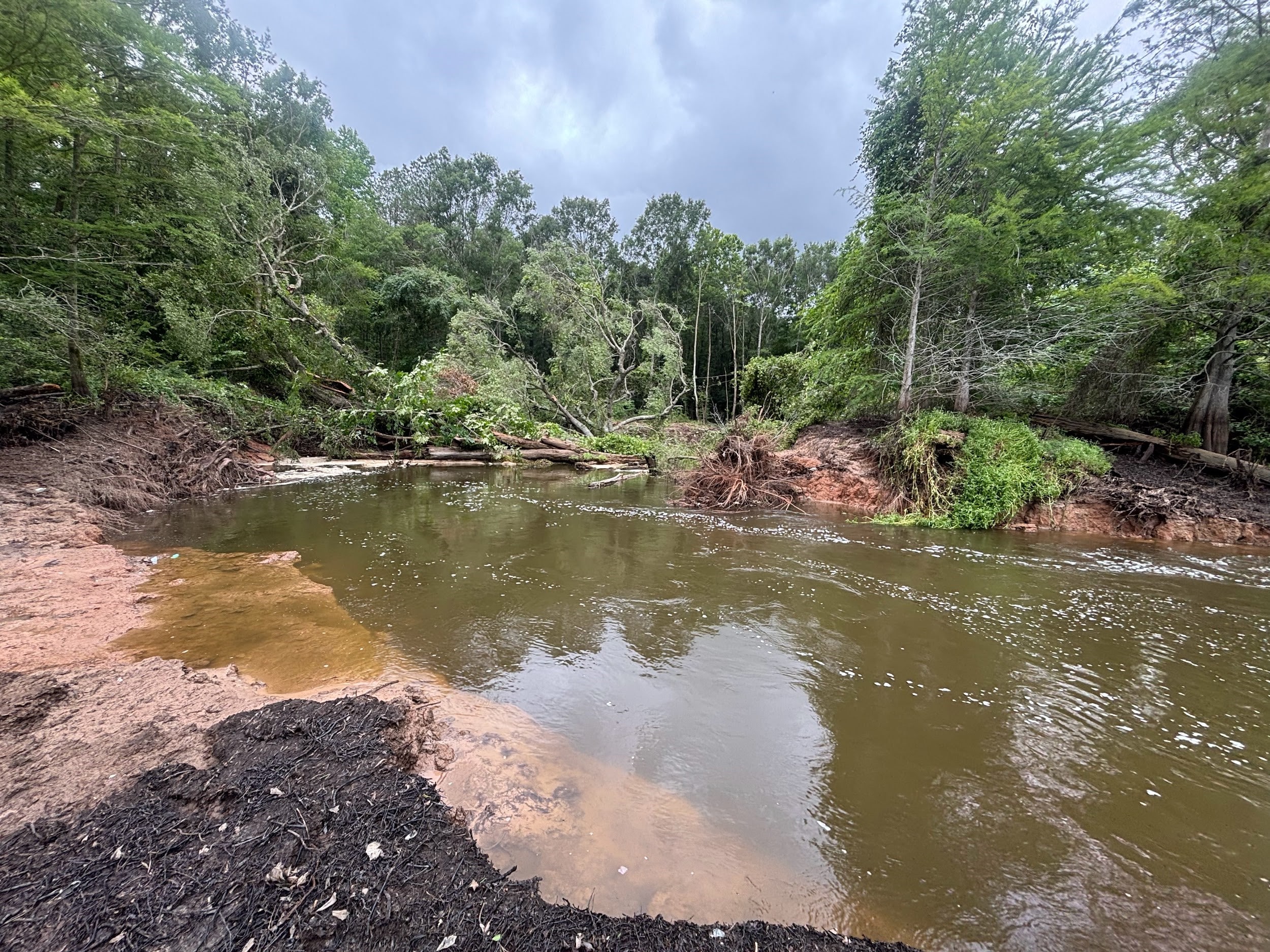 Multiple fallen trees destabilized the levee which had already seen damage from failing infrastructure earlier this year. AGFC photo by Levi Olhausen.