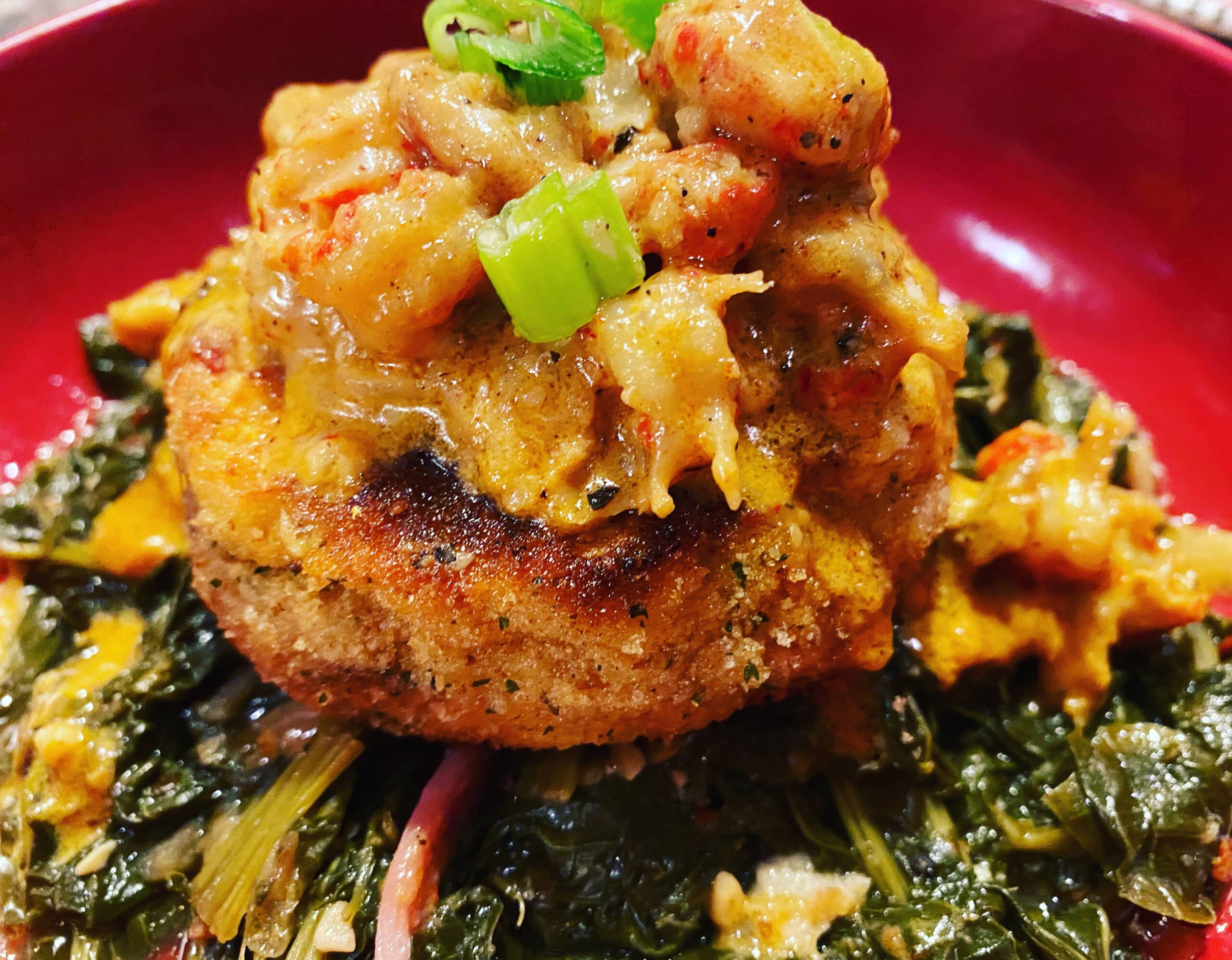 Prepare the etouffee first by melting 1/2 stick of butter in a large skillet over medium heat and stir in the flour; cook and stir for about 4 minutes or until caramel colored. Add the onion, bell pepper and celery; cook another 3-4 minutes or until tender, add the garlic and cook another minute. Slowly stir in the stock or broth until fully incorporated. Add the pepper and Cajun seasoning. Bring mixture to a boil; reduce heat to a medium low simmer, cover and simmer for 15 minutes, stirring occasionally. Add the crawfish tails, cook and stir until crawfish is heated through; stir in the parsley and green onion, reserving a bit for garnish. Hold over a very low simmer.