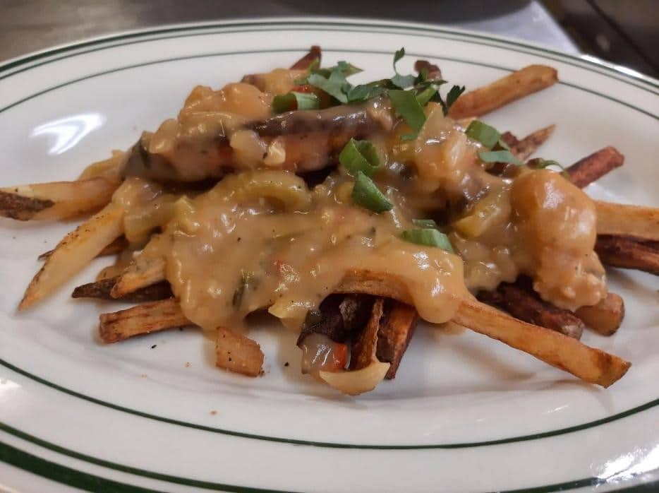 Place a heaping helping of fries onto a plate. Slather with swamp sauce, garnish with parsley and green onion. Wash this meal down with a cold beverage and relive those moments running lines with friends and family.