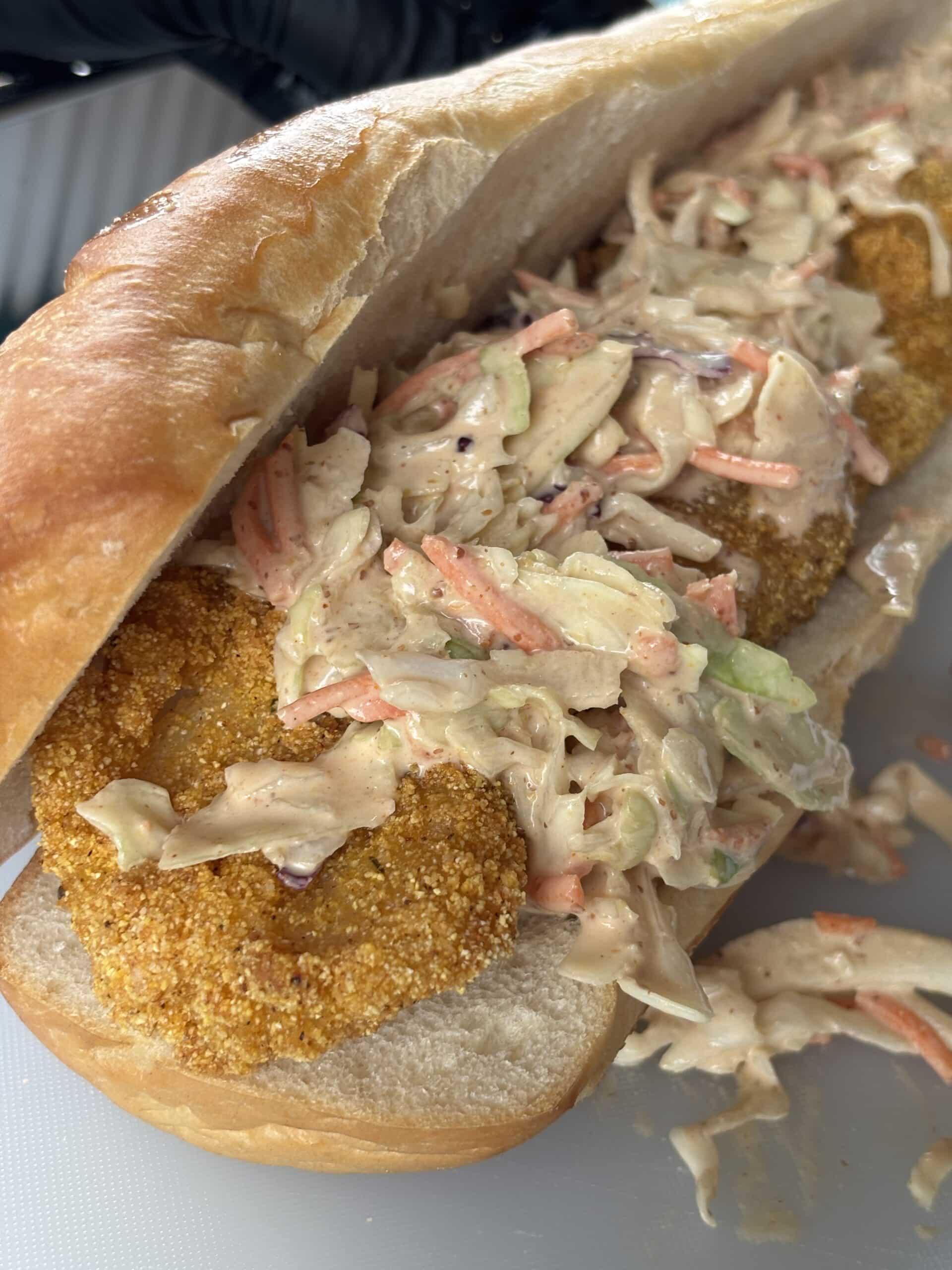 Assemble the sandwich by toasting a hoagie, add a layer of fish, topped with slaw. Enjoy with fries and hushpuppies.